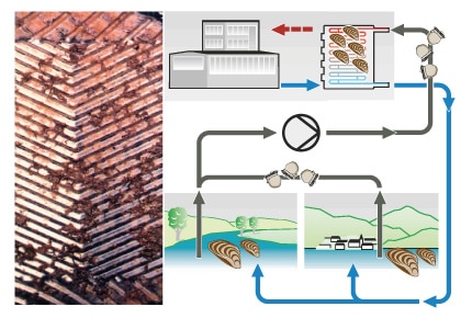 Problem-free operating heat exchanger, protected from mussel infestation by a DANGO & DIENENTHAL filter with MUSSEL STOP