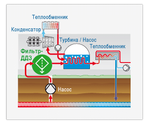 Через эксплуатационную скважину загрязненная геотермальная вода попадает в геотермальную установку. Специально для данного случая сконструированные фильтровальные системы «Данго и Диненталь» удаляют твердые примеси из обрабатываемой воды.